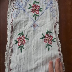 En broderad duk med blommönster.