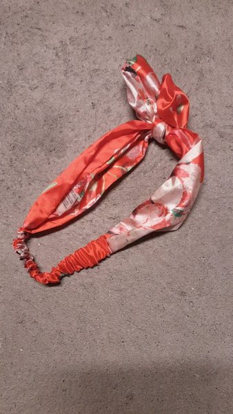 Ett hårband i rött och vitt med blommigt mönster. Hårbandet har en knut upptill och resår baktill.