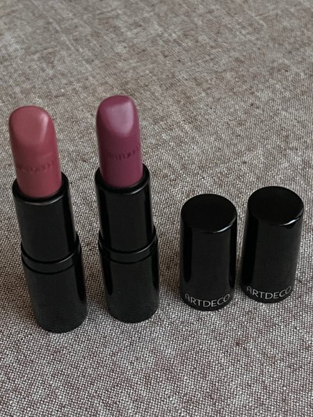 Två läppstift från Artdeco. Färgerna är en ljusare rosa och en mörkare lila/vinröd nyans.