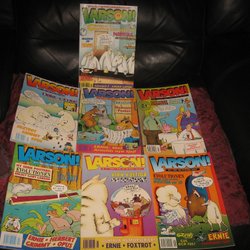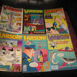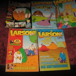 Samling av Larson! tidningar från olika årgångar. Inkluderar nummer med titlarna "Rossor Jordemodet!", "Färbor Sida Generations Extra", "Grullik!", "Ko-lossalt Monster-Darra Skrik Kamer Förtyvla", och "Avenyn Sprillans Färsk Galen Serie!". ISBN nummer syns på vissa tidningar: 7388003021005, 7388003020992.