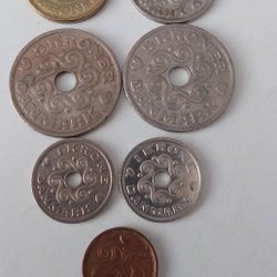 Här är en samling danska mynt. Inkluderar 5 Kroner från 1979, 1 Krone från 1976 och 1980.