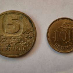 Två finska valutor med värdet 5 markkaa från år 1983.
