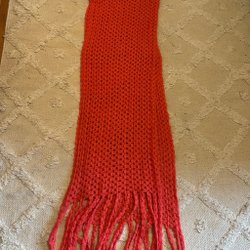 Här är en vacker, handgjord virkad sjal i en korallrosa nyans. Sjalen har ett intrikat blommönster och en triangulär form. Den mäter ca150cm på längden.och ca73cm djupt , ca 260gr