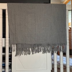 Grå stickad sjal med fransar. Sjalen har ett öppet stickat mönster.