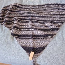 Sjalen har en öppen stickning och fransar längs nederkanten. Den kan bäras draperad över axlarna eller virad runt halsen för olika stilar.