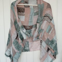 Sjal med ränder i rosa, gult, lila och grått. Sjalen har fransar i ändarna.