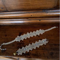 En vit handvirkad sjal. Sjalen har ett öppet mönster och fransar längs nederkanten. Den kan användas som en accessoar eller som ett värmande plagg. 200x50cm.