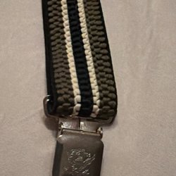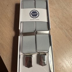 Röda hängslen med clipsfästen. Justerbara i längd med metallspännen.