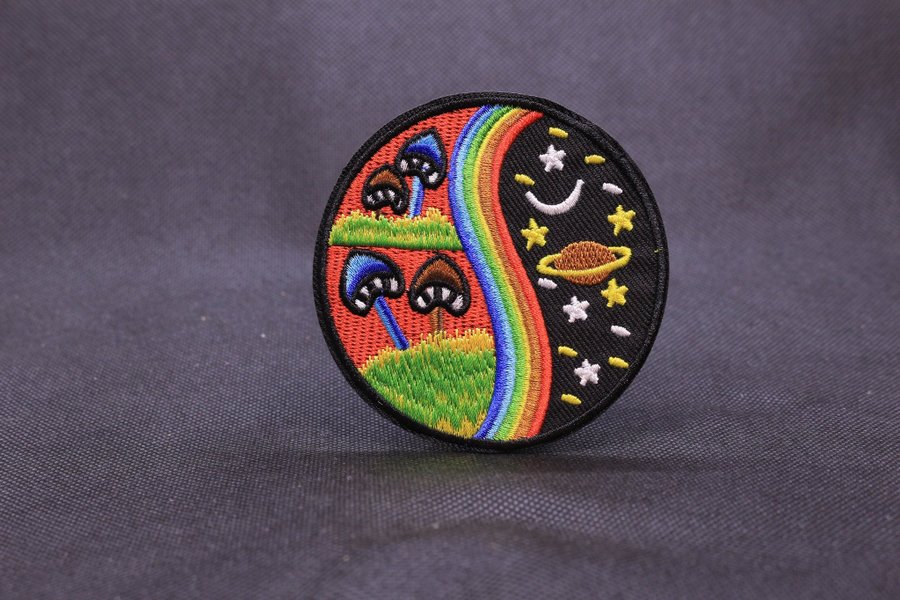 Broderad patch med ett motiv som kombinerar en fantasivärld med svampar och en regnbåge på ena sidan, och en natthimmel med stjärnor och en planet på den andra. Patchen har en svart kant.