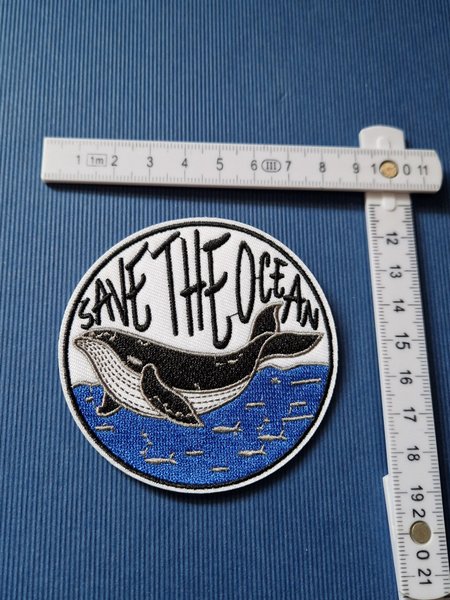 Broderad tygmärke med motiv av en val och texten "Save the Ocean".
