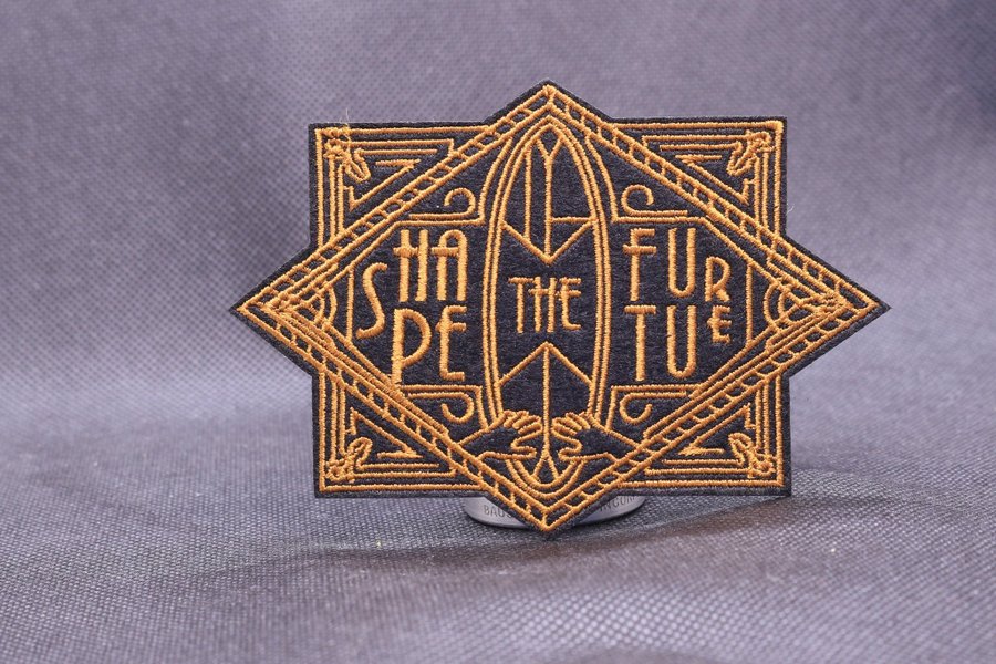 Broderad patch med texten "Shape the Future" i en dekorativ design med guldiga detaljer på svart bakgrund.