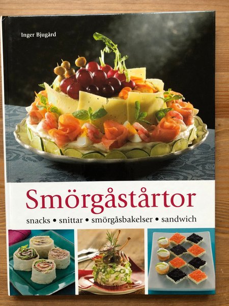 En inbunden kokbok med fokus på smörgåstårtor, snacks, snittar, smörgåsbakelser och sandwich.