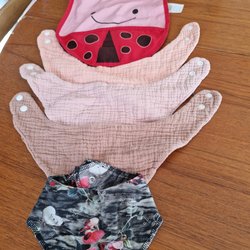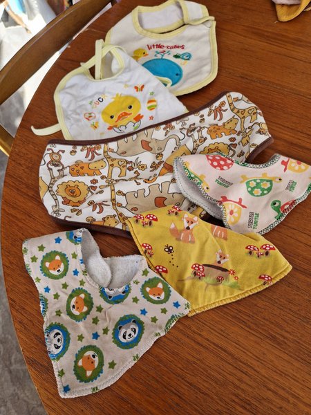 Ett set med sex haklappar i olika mönster och färger. Två av haklapparna är vita med gula kanter och knytband, den ena med en gul anka och den andra med en blå val och texten "little cuties". En haklapp är vit med bruna kanter och ett mönster av djur som giraffer, lejon och elefanter. Två haklappar är bandana-formade, en i gult med rävar och svampar, och en i ljusrosa med sköldpaddor. De sista två haklapparna är också bandana-formade, en med rävar och pandor omgivna av stjärnor, och en med rävar och pandor omgivna av stjärnor.