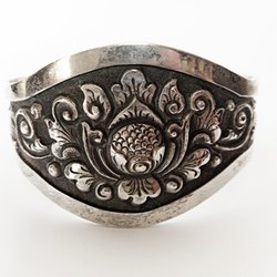 Silverarmband i sterling silver med dekorativ design. Armbandet öppnas och stängs med ett spänne. Är 17,6 gram. 5,5 cm i diameter.