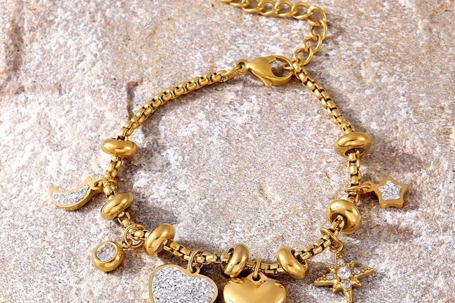 Ett vackert guldpläterat armband med olika berlocker som hjärtan, stjärnor och en måne. Armbandet har en justerbar längd.