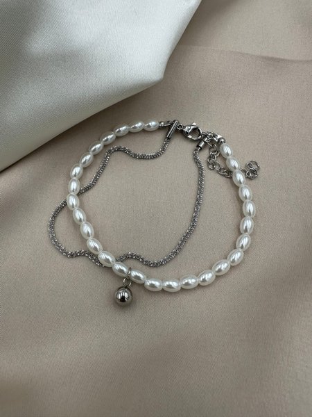 Ett elegant armband med pärlor och en silverfärgad kedja. Armbandet har ett silverfärgat hänge i form av en boll . Längd 17cm plus 4cm