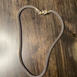 Ett mycket vackert halsband med ett intrikat mönster av sammanlänkade ringar. Halsbandet har en silverfärgad finish och en längd på cirka 64 cm, ca 8mm bred, väger 166 gram.