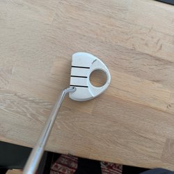 TaylorMade Ghost Corza putter. Längd 33". Klubban har ett rosa Karma-grepp och levereras med ett vitt putterskydd.