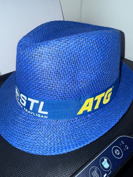 Blå hatt med ett band runt om. På bandet står det "STL Svenska Travligan" och "ATG" i gul text.