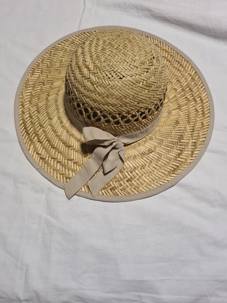 En elegant solhatt i flätat utförande med ett dekorativt band och rosett runt kronan. Hatten har en bred brätte som ger bra skydd mot solen.