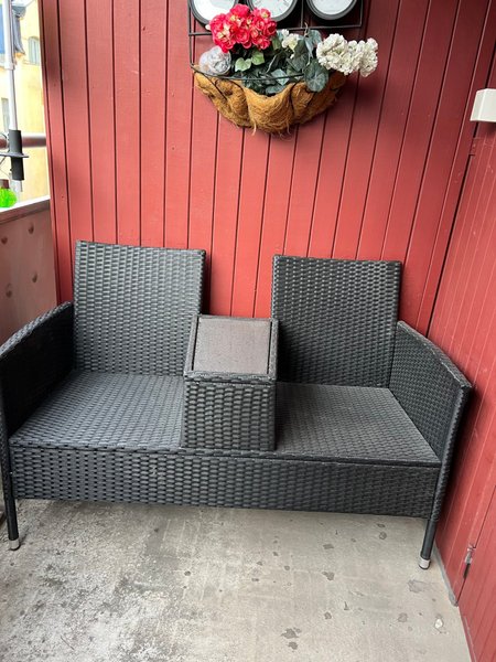 Bekväm soffa i svart rottingimitation för balkongen eller uteplatsen. Perfekt för avkoppling utomhus. 128 cm bted och 60 cm djup.