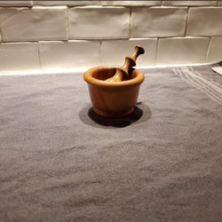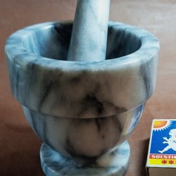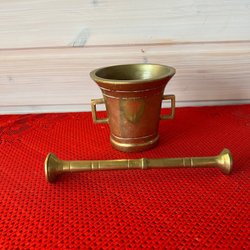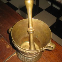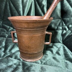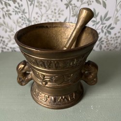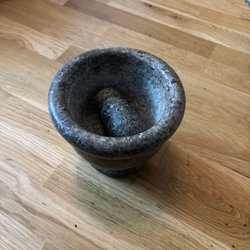 Mortel med tillhörande stöt. Gjutjärn.