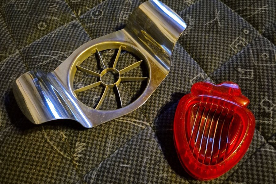 Äppeldelare i rostfritt, jordgubbsskärare i plast.
