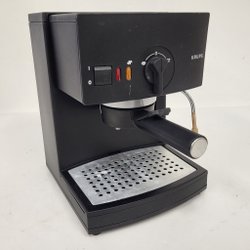 Kaffemaskin med flera valmöjligheter för drycker. Maskinen har knappar för olika kaffestyrkor eller typer av kaffe. Den är svart med en grön indikatorlampa och röda lampor undertill. Maskinen är designad för att stå på en bänk eller hylla.