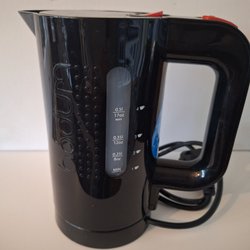 En vattenkokare i rostfritt stål med svart handtag och bas. Perfekt för att snabbt koka vatten till te, kaffe eller andra varma drycker. Kokaren har en liten transportskada den sida som inte har en varningsetikett, jag har kört 2 uppkok och allt fungerade. Volym 1,8 l 15 cm botten och 25 cm hög. Eu kontakt 240 V 1500W.