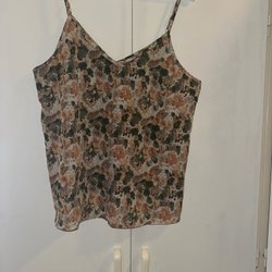 Randigt linne med breda axelband och rund halsringning. Färgerna är bland annat brun, rosa, vit och gul.