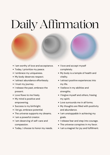 Affirmationsposter med texten "Daily Affirmation" och en lista med positiva affirmationer. Postern har tre färgade cirklar i bakgrunden.