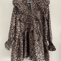 Klänning med ett mönster i olika nyanser. Den har långa ärmar och en volang nedtill.