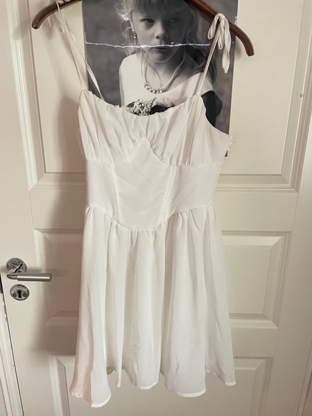 Vit klänning med smala axelband och markerad midja. Klänningen har en kort, utsvängd kjol. Klänningen är ifrån Shein