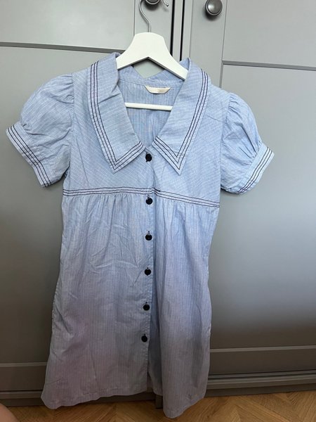 Ljusblå klänning med vita ränder och svarta detaljer. Klänningen har en krage och knappar framtill.