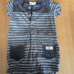 Randig baby pyjamas med långa ärmar och knappar framtill. Det finns en liten ficka på bröstet med texten 'oh happy day'.