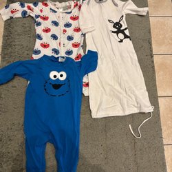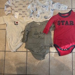Ett set med fem sparkdräkter i olika färger och mönster. Setet innehåller en grön sparkdräkt med dragkedja, en svart sparkdräkt med bilar, en randig sparkdräkt i rött, grönt och vitt, en vit sparkdräkt med krabbor och en blåvit randig sparkdräkt med en spindel.
