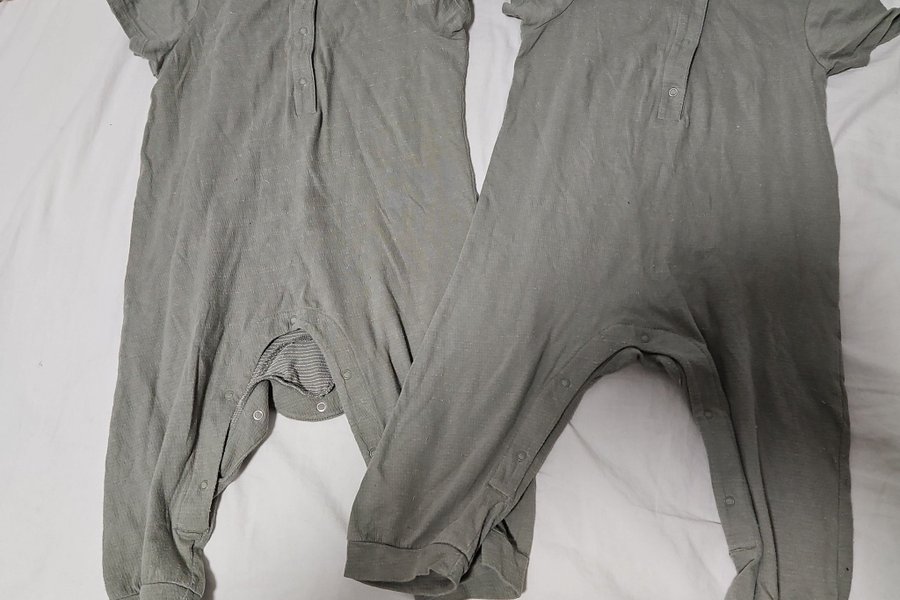 Två mörlgröna sparkdräkter med korta ärmar och knappar framtill. Sparkdräkterna har även knappar längs benen för enklare påklädning.
