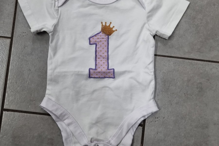 Vit babybody med korta ärmar. Bodyn har ett tryck av siffran 1 i lila med en guldfärgad krona ovanpå.