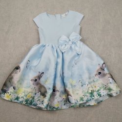 Säljer ett par byxor som är rosa i färgen och har motiv på kaniner vid knäna.