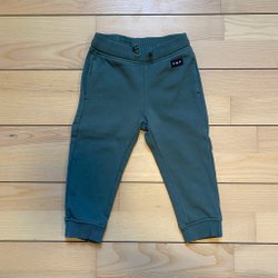 Ett par olivgröna byxor med muddar nedtill och resår i midjan. Byxorna har detaljerade sömmar vid knäna och en dekorativ patch i midjan.