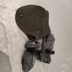 Ett par gröna flecce byxor med resår i midjan och muddar vid bensluten. Stl 90