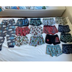 Detta är ett klädpaket med barnkläder. I paketet ingår bland annat en Cars-tröja med långa ärmar, en gul tröja med tryck, en blå Pikachu-tröja, två gråblå tröjor med fordonstryck, tre vita tröjor, ett par beiga byxor och en grön skjorta. Dessutom ingår ett par svarta Adidas-träningsbyxor med vita ränder. Blå tröja med grävmaskin har mindre hål i sig men inget som stör användningen.