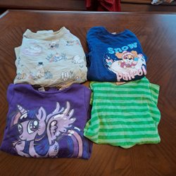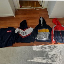 Ett paket med olika tröjor och en hoodie. Innehåller en vit stickad tröja, en rosa poncho med fransar, en grå stickad tröja, en beige tröja med tryck och en grå hoodie. Det finns även en randig tröja. Storlek 134/140