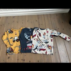 Säljer ett paket med fyra stycken långärmade tröjor i storlek 98/104. Plaggen kommer från H&M och Lindex. Är i gott skick! Hittade en tråd som släppt lite på den randiga tröjan samt en liten fläck som ser ut som att färgen blekts på ett ställe. Trycket är lite slitet men helt på rävtröjan och grodtröjan.