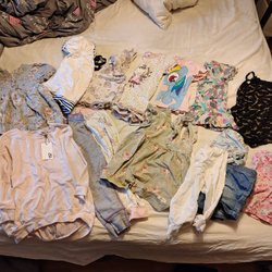 Detta är ett klädpaket med blandade barnkläder. I paketet ingår byxor, tröjor, bodys och en jacka. Färgerna varierar och det finns olika mönster.