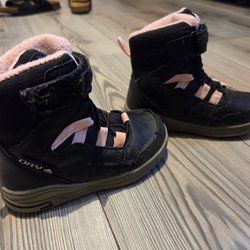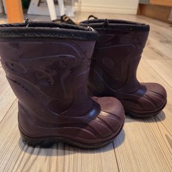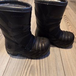 Grå jacka med avtagbar huva och svarta täxkbyxor med hängslen. Hälremmarnq är hela. Jackan har knappar och fickor framtill. Byxorna har reflexer nedtill. Köpta på ullared och är i fint skick.