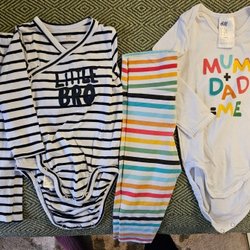 Ett sött paket med barnkläder. Inkluderar en stickad kofta (Newbie), ett par rosa leggings med svarta ränder längs sidan (Molo), och två tyllkjolar - en ljusblå och en svart. Kjolar är av märket Newbie.