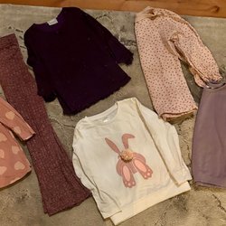 Detta är ett klädpaket med olika plagg. I paketet ingår bland annat en grön tröja med en enhörning, en grå tröja med texten "WE WILL CHANGE THE WORLD", ett par jeans, en vit hoodie med en hund på, en gul tröja och en grå byxa. Det finns även en hoodie med texten "Chicago".