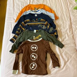Detta är ett klädpaket för barn som innehåller en pyjamas med stjärnor, en svartvit rutig skjorta, en långärmad tröja med Musse Pigg tryck, ett par mörkblå byxor, flera t-shirts med olika tryck och motiv, samt ett par grå shorts.strl 74/80