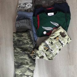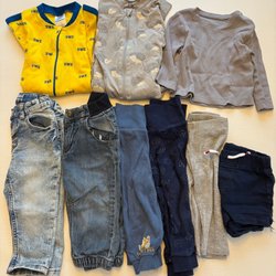 Ett paket med barnkläder. Innehåller en grå och svart rutig hoodie med dragkedja, en grå och svart tröja med texten ”dinosquad” och ”cool”, en mörkblå långärmad tröja med Musse Pigg tryck, ett par blå jeans hängselbyxor, ett par grå byxor med djurmotiv, ett par grå jeans och ett par ljusblå byxor.strl 92/98